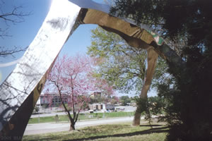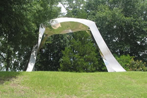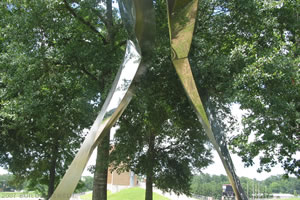 The Rainbow Walker sculpture overlooks the parking lot on the western edge of Bowers Stadium. The piece is 5,000 pounds of stainless steel and the creation of artist Ali Baudoin.