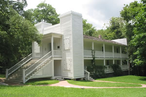 Dr. Rufus W. Bailey, a former president and professor at Austin College, had acquired an eight-acre tract on a site now part of Oakwood Cemetery and erected a house which he named "Buena Vista," but which became known as "The Steamboat House" because its unusual design evoked the image of a double-decker steamboat. The house was a wedding gift for Bailey’s son, Frank, but Huntsville lore says the couple refused to live there. In 1862, Bailey rented the house to Sam Houston, the-then disposed governor, who died of pneumonia there in July 26, 1863. In November of 1863, Frank Bailey sold the house and grounds to A. C. McKeen for $4,000. The house was sold again, this time for $1,500, on December 25, 1866 to Pleasant W. Kittrell, a Huntsville physician and former member of the legislature. He died in the house on September 29, 1867. His family continued to live there until January 1874, when his widow traded the property to Thomas J. Goree for a house in Madison County. Goree, superintendent of the Texas prisons, used convict labor to remodel the front of the building and give it a Victorian style. Goree owned the house and grounds until April 1891, when they were purchased by I. N. Smith for $2,250. Smith in turn sold the property in August 1917 to the Lamkin Brothers, a Huntsville hardware firm; in March 1925 the property was bought by the Oakwood Cemetery Association for $3,500. In 1928 the association sold the house to J. H. Johnson, who moved it one-half mile to North Main Street. Houston businessman J. E. Josey bought the house for $500 in 1933 and announced plans to restore it to its original appearance. Efforts for this project were delayed until 1936 when the house, long used for squatters and the homeless, was dismantled and moved to the museum grounds where it was formally presented to the state on March 2, 1936 - Texas Independence Day. Restoration took less than a year and the refurbished house was opened on March 2, 1937.