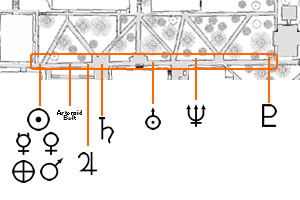 The ground level plaques, beginning between the Farrington and Estill Buildings and ending 645 feet away near Austin Hall, have weathered throughout the years, with dirt and grass making some of the plates difficult to read. The size of the planets and the distance between them has been reduced 30 billion times in this model; by this scale, the sun would be the size of a plum, the earth would be the size of a grain of salt and Pluto would be no larger than a tiny grain of pepper. If the scale were continued, the plaques note the nearest star, Alpha Centauri, would be 836 miles north of campus, roughly around Des Moines, Iowa.