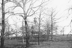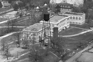The university Water Tower stood east of the main quadrangle, southeast of the Education Building, in the vicinity of what is now the Farrington Building.